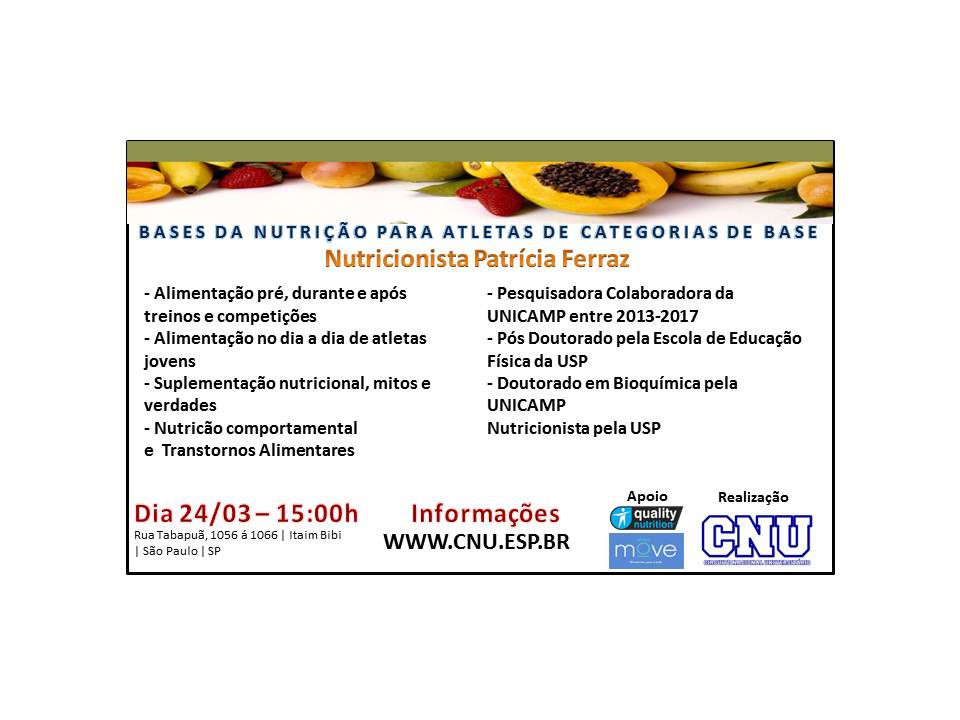 O CNU lança sua primeira palestra: BASES DA NUTRIÇÃO PARA ATLETAS ENTRE 8 E 15 ANOS, com a Nutricionista Patricia Ferraz - Pesquisadora Colaboradora da UNICAMP (2013-2018), possui Pós Doutorado pela Escola de Educação Física da USP e Doutorado em Bioquímica pela UNICAMP. Formada Nutricionista pela USP